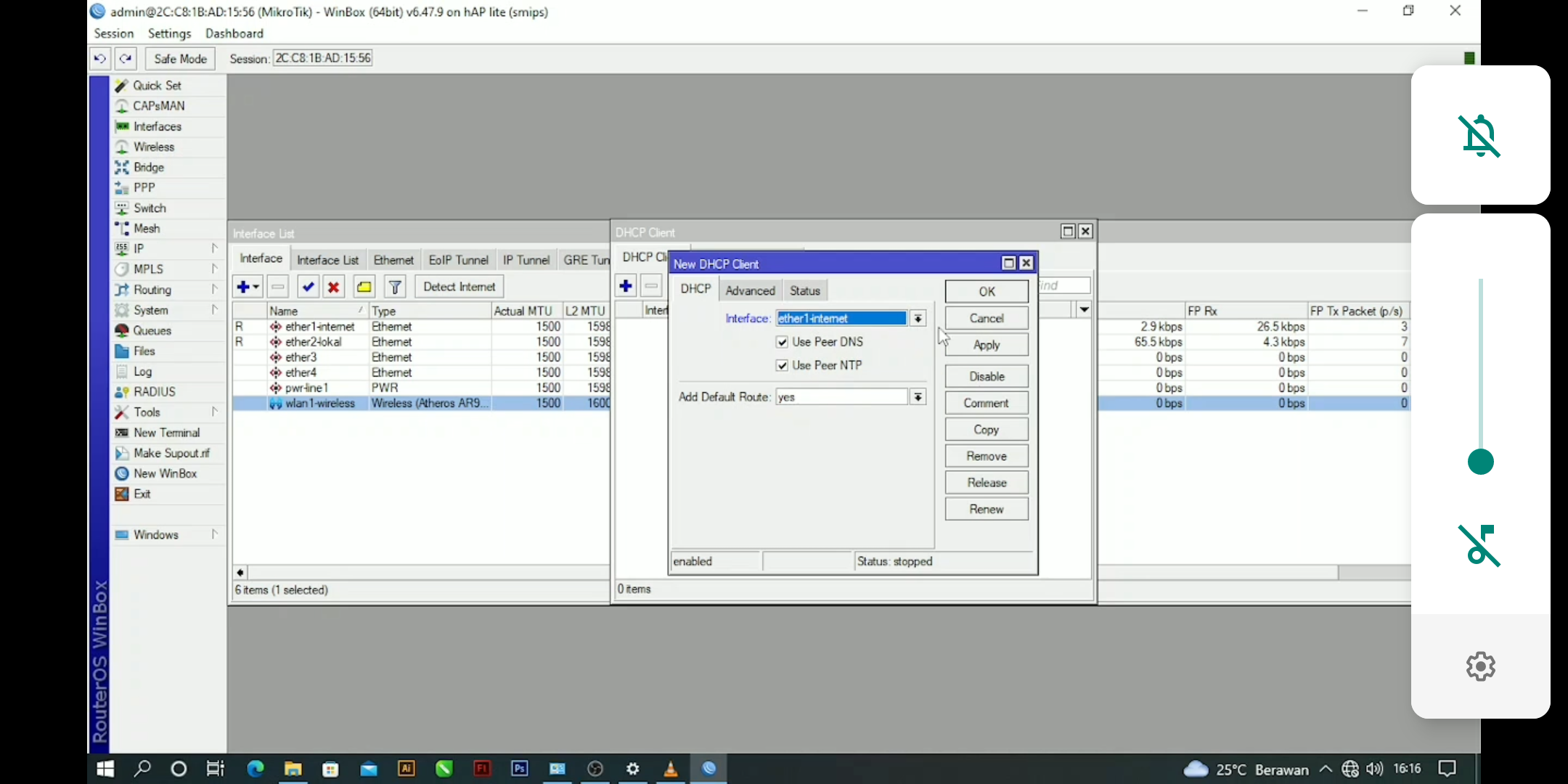 kemudian masuk ke menu ip>dhcp client>+ lalu interface nya kita pilih yang ether1-internet lalu apply & oke